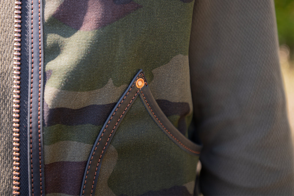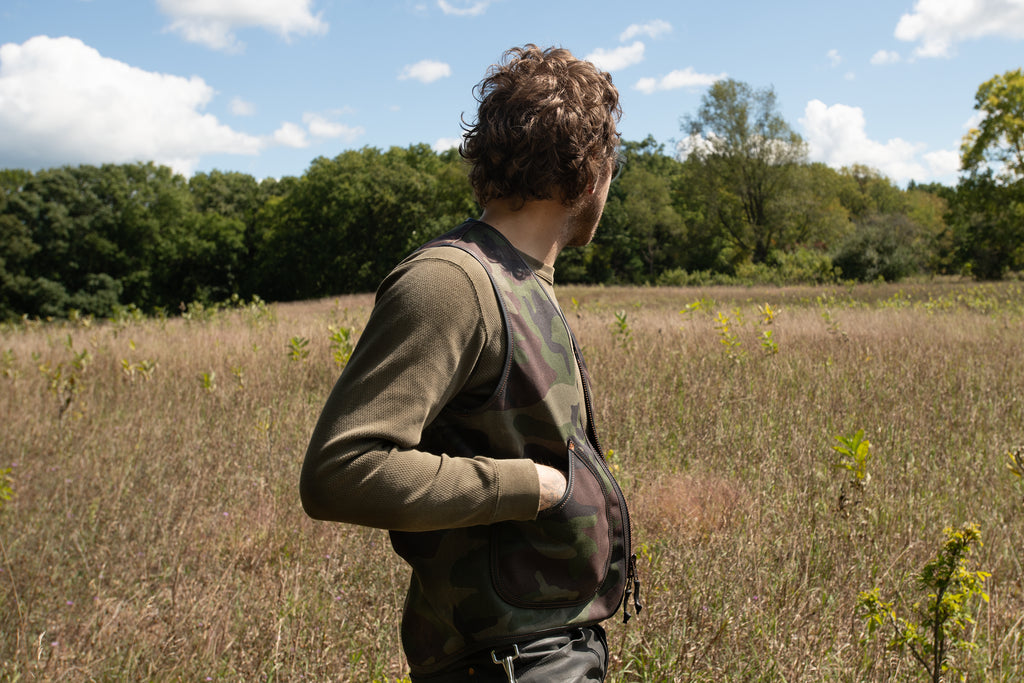 - $399. LIMITED. This vest is made with heavyweight camo waxed canvas and is lined with hunter orange moleskin. The construction of each vest is very durable, there are only two seams at the top of the vest making it a one piece pattern. The two large hand pockets are lined and curved to help keep all your belongings in place. There is also one inside pocket. The vests are finished with leather binding, a custom YKK two way zipper and copper rivets. These are a true nod to the classic outdoorsman. The model is 6ft, 180 lbs and is wearing a Small. MADE TO ORDER: please allow 2-3 weeks for production. Handmade in our Grand Rapids, Michigan shop.