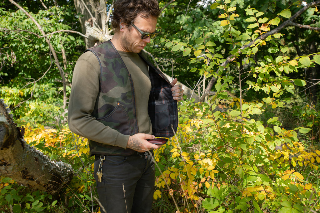 - $399. This vest is made with a heavyweight camo waxed canvas and is lined with a thick plaid wool. The construction of each vest is very durable, there are only two seams at the top of the vest making it a one piece pattern. The two large hand pockets are lined and curved to help keep all your belongings in place. There is also one inside pocket. The vests are finished with leather binding, a custom YKK two way zipper and copper rivets. These are a true nod to the classic outdoorsman. The model is 6ft, 180 lbs and is wearing a Small. MADE TO ORDER: please allow 2-3 weeks for production. Handmade in our Grand Rapids, Michigan shop.